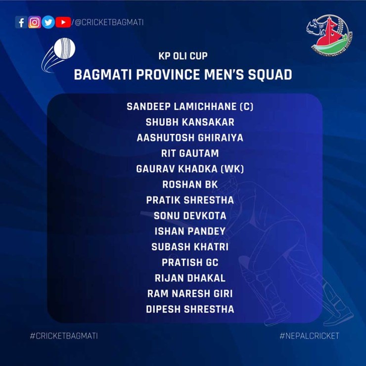 टिममा सन्दीपसँगै राष्ट्रिय टिमका प्रतिश जिसी, यसअघि राष्ट्रिय टिमबाट खेलिसकेका रामनरेश गिरी, इशान पाण्डे र दिपेश श्रेष्ठलाई समावेश गरिएको छ । बागमती प्रदेशको टीम: सन्दीप लामिछाने (कप्तान), सुभ कंसाकार, आशुतोष घिरइया, रित गौतम, गौरव खड्का (विकेटकिपर), रोशन विक, प्रतिक श्रेष्ठ, सोनु देवकोटा, इशान पाण्डे, सुबास खत्री, प्रतिश जिसी, रिजन ढकाल, रामनरेश गिरी र दिपेश श्रेष्ठ ।