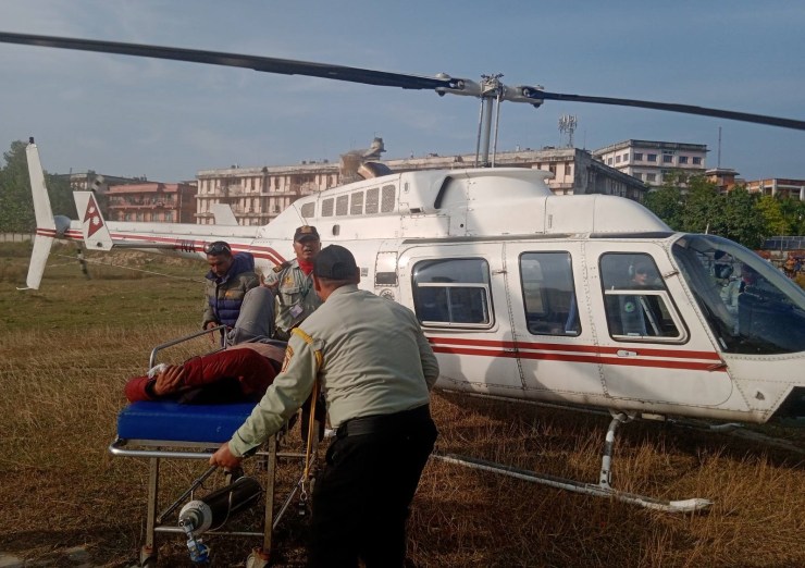 रुकुम पश्चिम चौरजहारीमा सडक दुर्घटनामा परेर गम्भीर घाइते भएका एक व्यक्तिलाई हवाई उद्धार गरी कोहलपुर पुर्याइएको छ ।