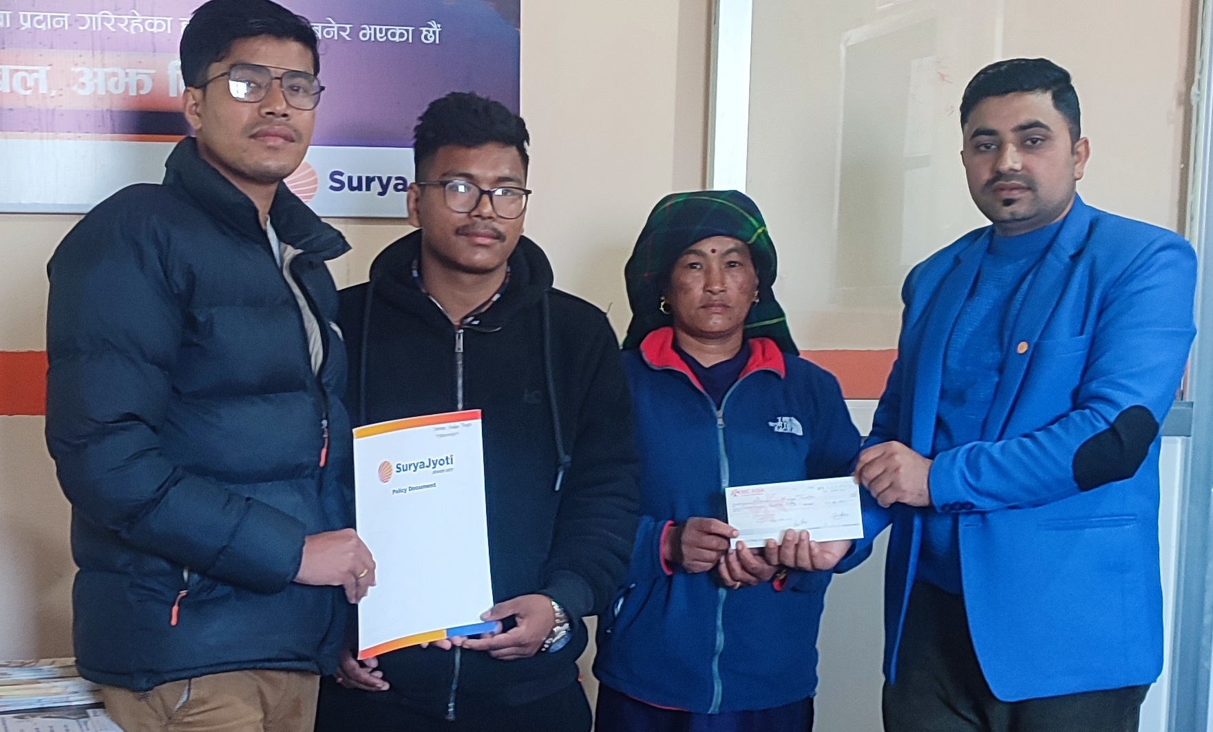 कम्पनीका पुतलीबजार शाखा प्रमुख सुजन पोखरेलले मृतक थापाकी श्रीमती नारायणी माया थापालाई दाबी रकम बराबरको चेक हस्तान्तण गरेका छन् । रोजगारीमा जाने क्रममा मृतक थापाले सूर्यज्योति लाईफ ईन्स्योरेन्समा म्यादी बीमा गरेको कम्पनीले जनाएको छ । थापाको मृत्युपछि उनकी श्रीमती नारायणीले कम्पनीले हालसालै जारी गरेको “सूर्यज्योति सही प्लान” अन्तर्गत १२ लाख बराबरको आजीवन बीमा गरेकी छन् । उच्च रक्तचापका कारणले मृत्यु भएका थापाका २२ वर्षका १ छोरा मात्र छन् ।