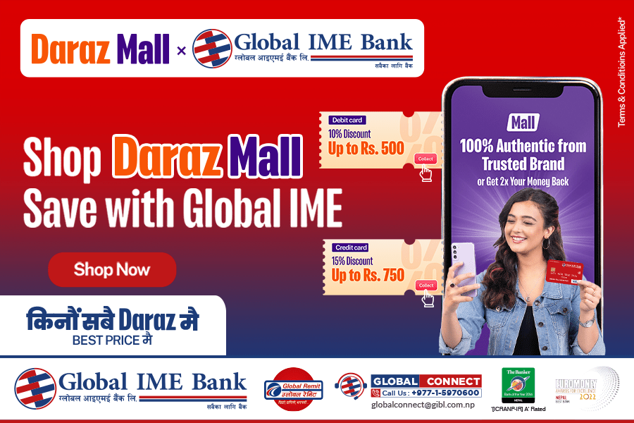 ग्लोबल आईएमई बैंकका कार्ड बाहक ग्राहकलाई दराजबाट अनलाइनमार्फत सामान किन्दा १५ प्रतिशतसम्म छुट पाउने योजना सार्वजनिक भएको छ।