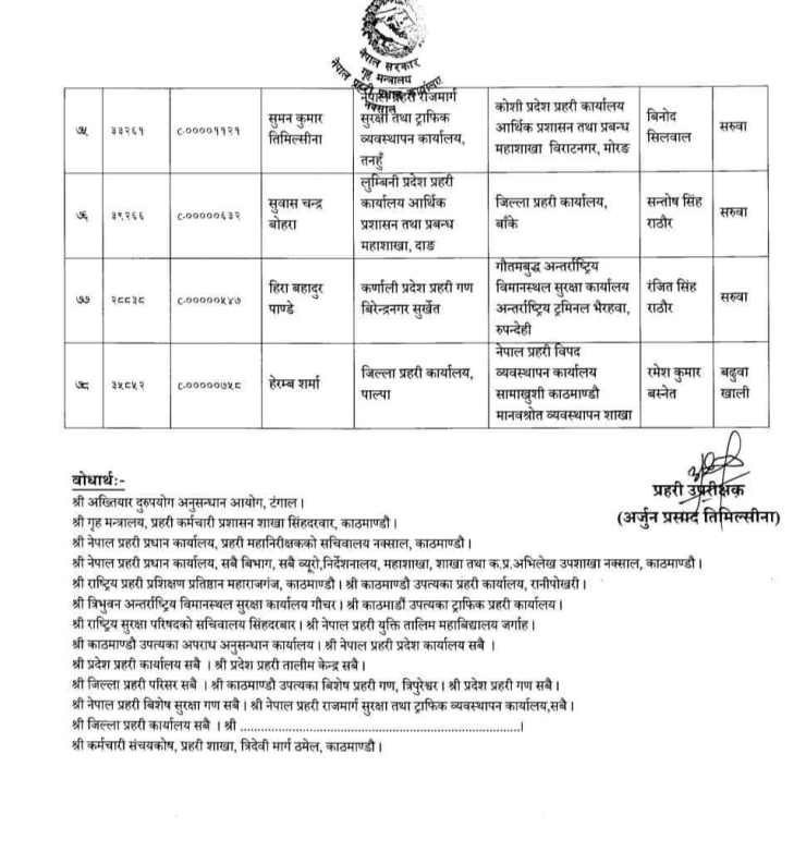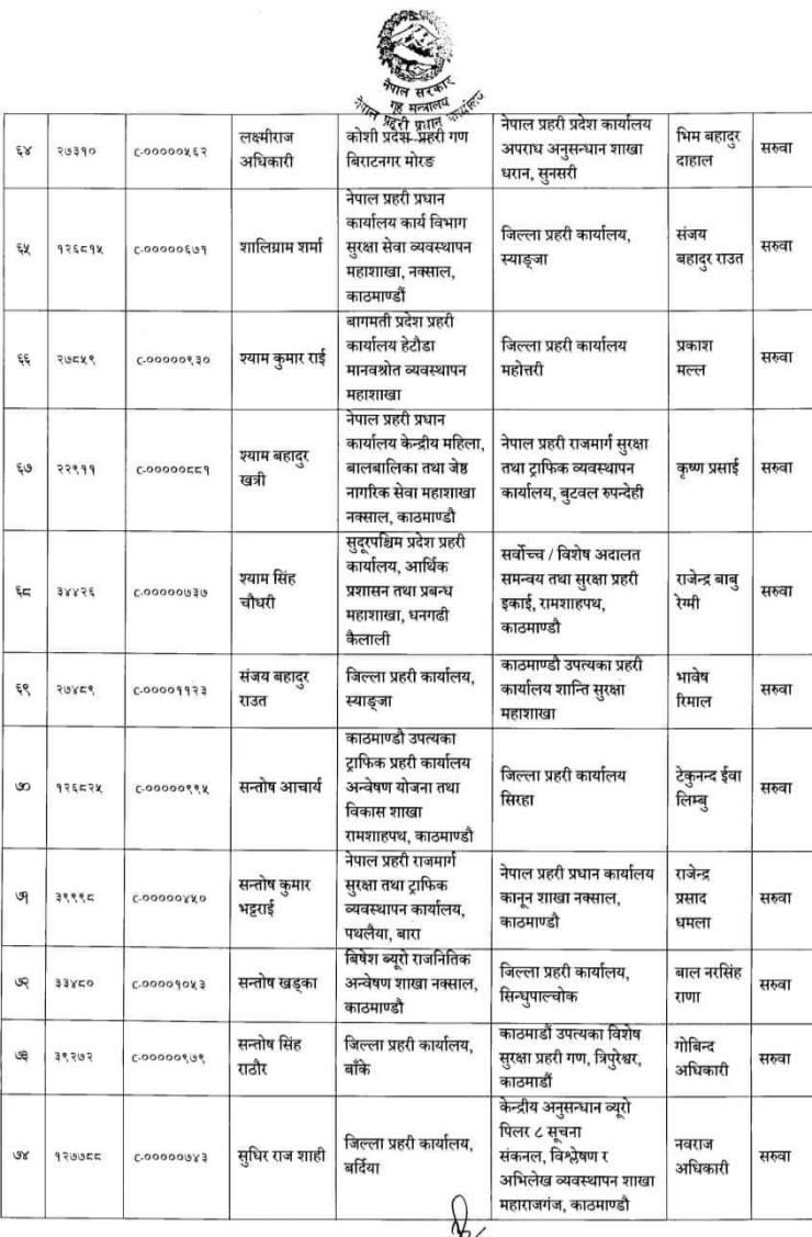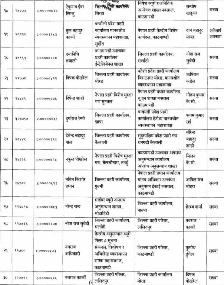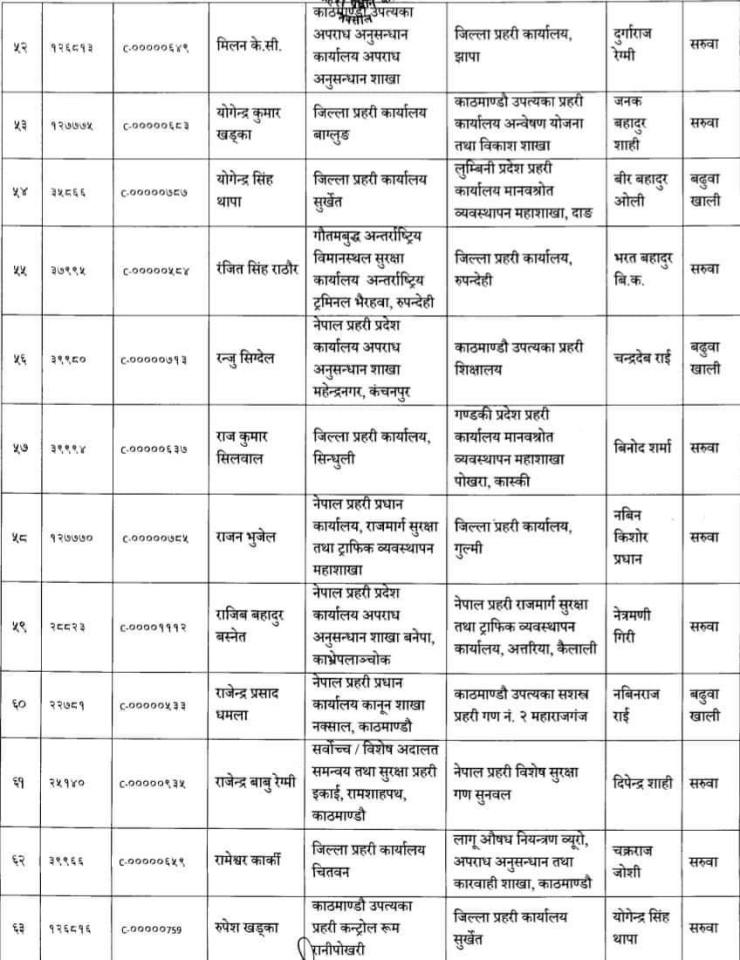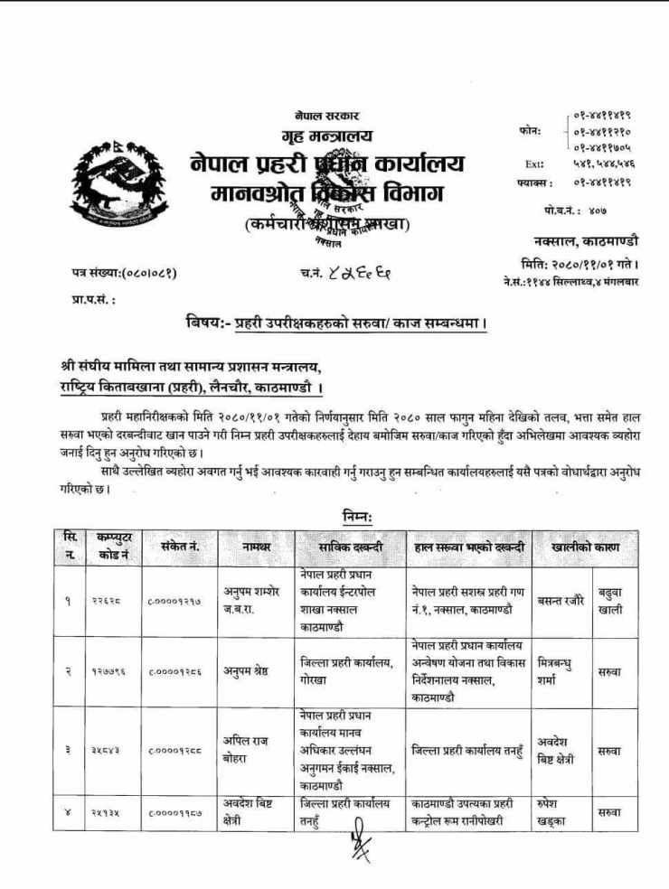 प्रहरी प्रधान कार्यालय, मानव स्रोत विकास विभागले सूचना जारी गर्दै २०८० फागुन महिनाको तलब, भत्ता समेत सरुवा भएको दरबन्दीबाट खान पाउने गरी एसपीहरुको सरुवा गरिएको जनाएको छ।