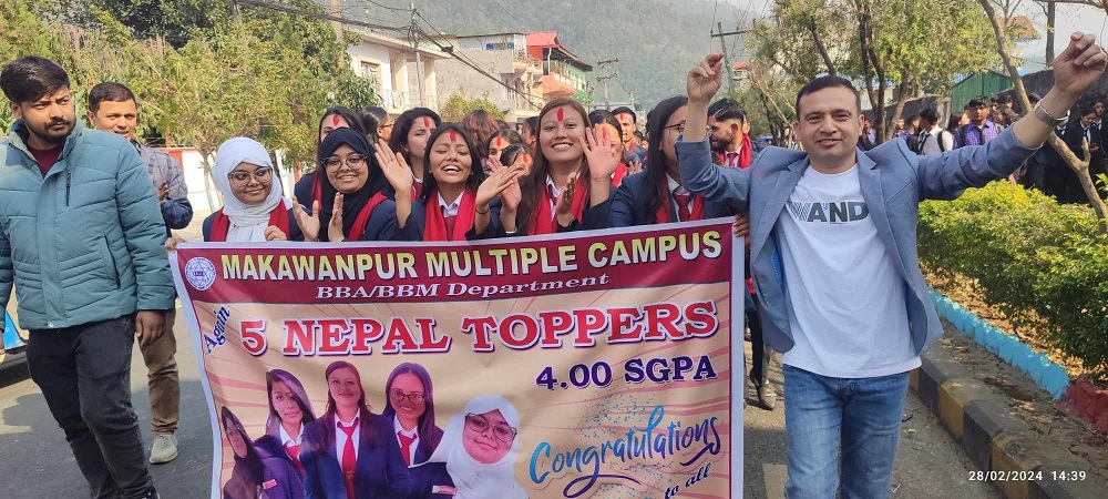 त्रिभुवन विश्वविद्यालय परीक्षा नियन्त्रण कार्यालयले सार्वजनिक गरेको बीबीए पाँचौँ सेमेस्टरको नतिजामा मकवानपुर बहुमुखी क्याम्पस नेपाल टप हुन सफल भएको खुसीयालीमा बुधबार र्याली निकालिएको हो।