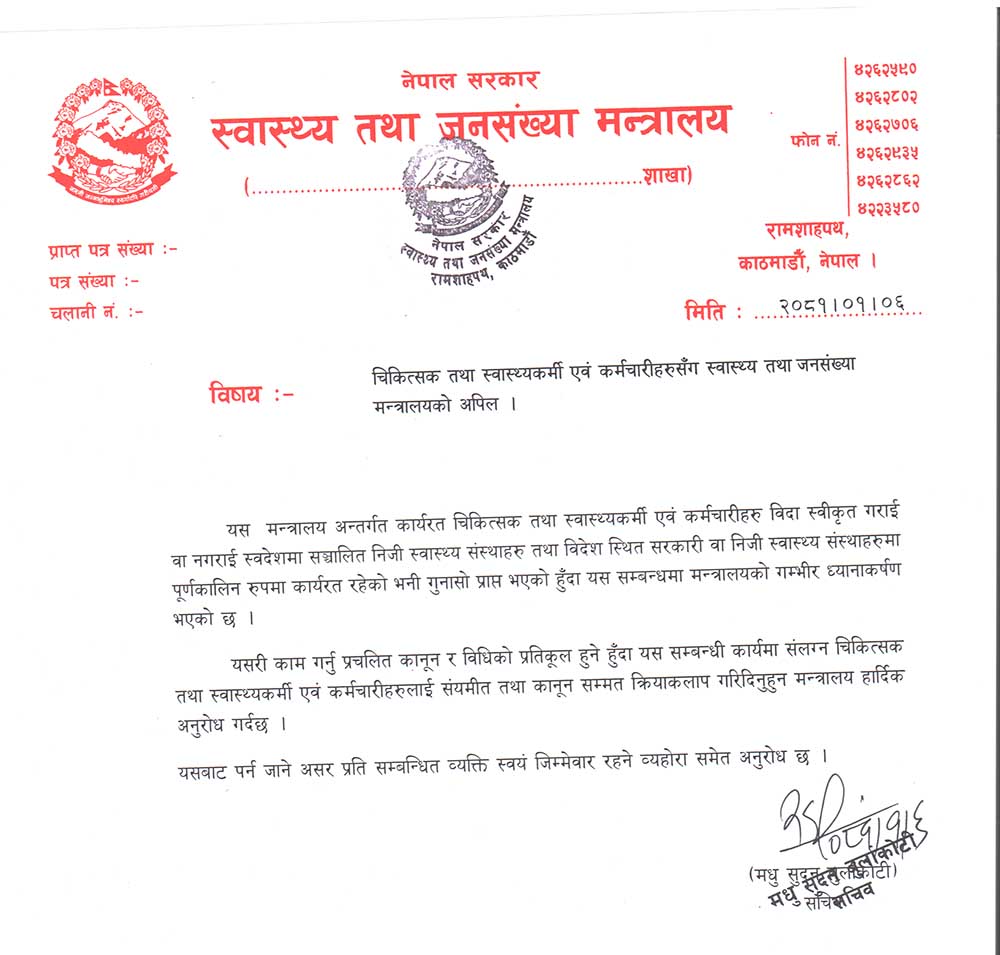 विहिबार एक विज्ञप्ति जारी गर्दै स्वास्थ्य मन्त्रालयले मन्त्रालय अन्तर्गत कार्यरत चिकित्सक, स्वास्थ्यकर्मी एवं कर्मचारीहरु बिदा स्वीकृत गराई वा नगराई निजी स्वास्थ्य संस्थामा साथै विदेशी स्वास्थ्य संस्थामा कार्यरत रहेको गुनासो आएको भन्दै मन्त्रालयको ध्यानाकर्षण भएको जनाएको छ ।