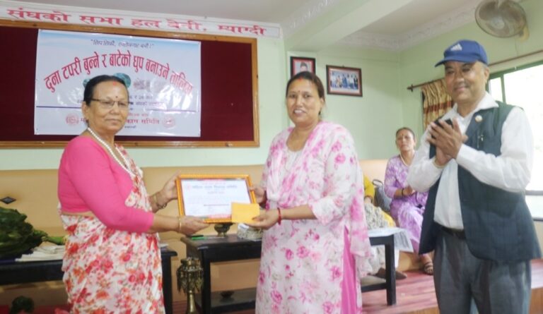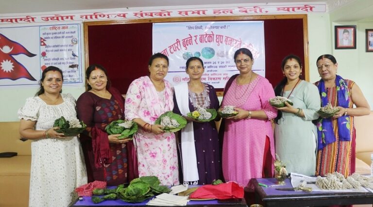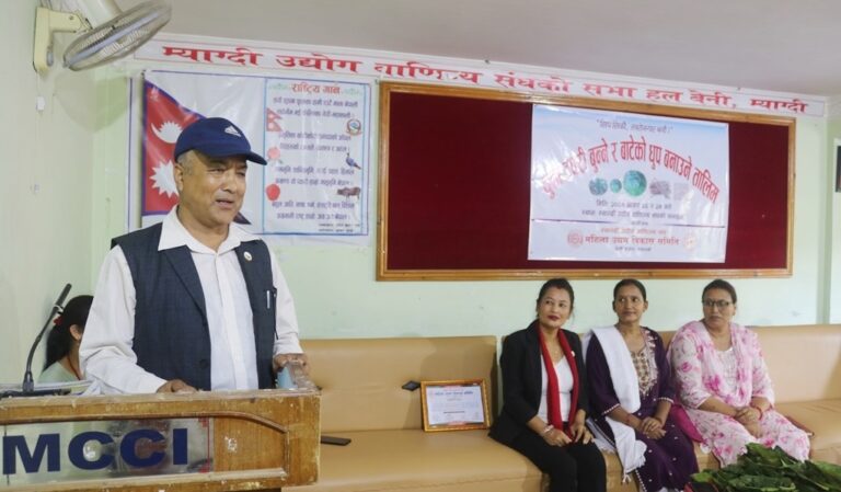 यसैक्रममा म्याग्दीको सदरमुकाम बेनीमा पनि दुई दिनसम्म महिलाहरुलाई लक्षित गरेर पेसा, व्यवसायमार्फत आत्मनिर्भर बनाउनका लागि जीवनपयोगी सिपमूलक सम्बन्धी तालिम प्रदान गरिएको छ । ‘सिप सिकौं, स्वरोजगार बनौं’ भन्ने मूल नारासहित शनिवार र आइतबार बेनीमा दुनाटपरी बुन्ने तथा बाटेको धूप बनाउने तालिम सम्पन्न भएको छ । म्याग्दी उद्योग वाणिज्य संघ, महिला उद्यम विकास समिति म्याग्दीको आयोजनामा संघको सभाहलमा तालिम सञ्चालन गरिएको थियो ।