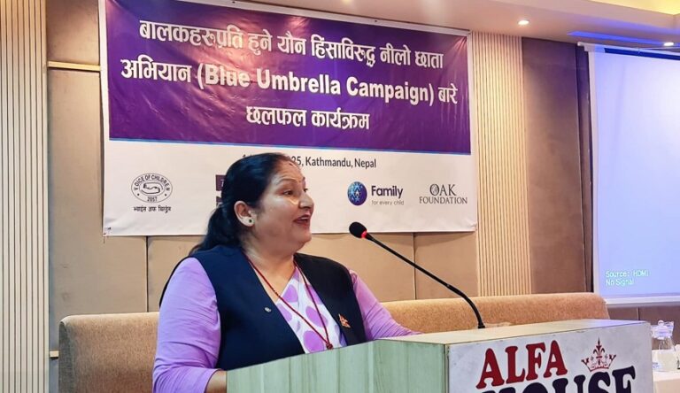 “बालकहरुमाथि हुने यौन हिंसाको घटनालाई नीलो छाता अभियानले विश्वसामु फैलाएको छ, कानुनी मान्यताको लडाईमा पनि लागिरहेको छ”, उनले भनिन् , “नेपाल पनि यो अभियानमा लागेको छ ।”