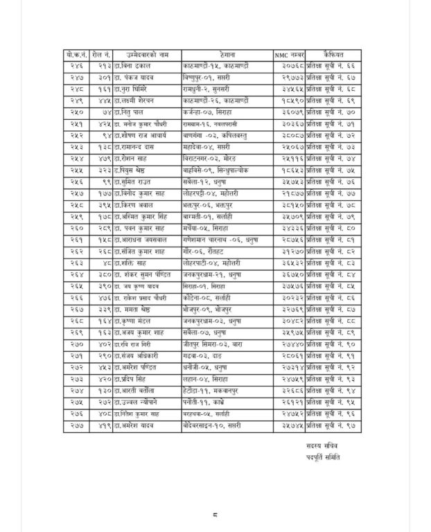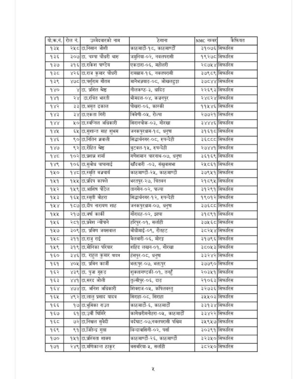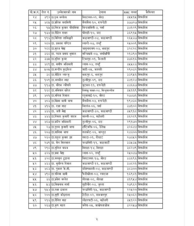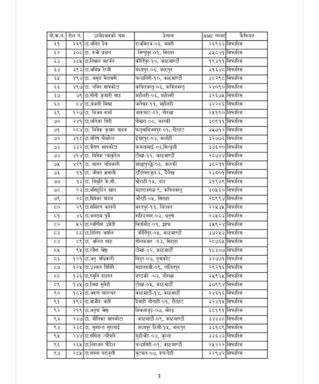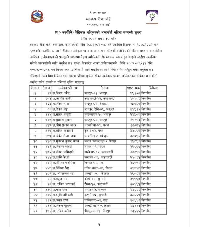 स्वास्थ्य बीमा बोर्डले तीन महिने सेवा अवधिका लागि १८० जना मेडिकल अधिकृत (चिकित्सक) सिफारिस गरेको छ। बोर्डले अन्य ९७ जनालाई प्रतीक्षा सूचीमा राखेको छ। बोर्डले गत १८ जेठमा ९० दिनका लागि करार सेवामा चिकित्सक आवश्यक पर्ने भन्दै आवेदन आह्वान गरेको थियो।