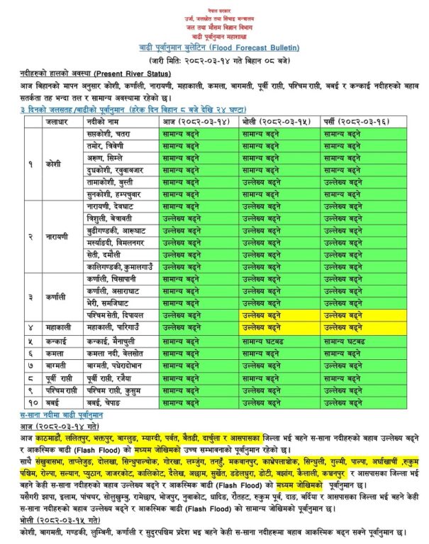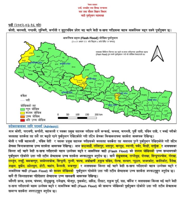 महाशाखाले विशेष सतर्कता अपनाउन आग्रह गर्दै पहाडी तथा तराईका केही स्थानमा आइतबार रातिदेखि सोमबार बिहानसम्म ठूलो वर्षाको सम्भावना रहेको चेतावनी दिएको छ।