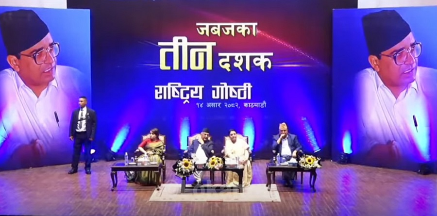 जननेता मदनकुमार भण्डारीको ७४औं जन्मजयन्तीका अवसरमा मदन भण्डारी फाउण्डेशनले काठमाडौँमा आयोजना गरेको ‘जबजका तीन दशक’ राष्ट्रिय गोष्ठी जारी छ । राष्ट्रिय सभागृहमा आयोजित उक्त कार्यक्रममा प्रधानमन्त्री एवं नेपाल कम्युनिष्ट पार्टी (एमाले) का अध्यक्ष केपी शर्मा ओली र पूर्व राष्ट्रपति विद्यादेवी भण्डारी एउटै मञ्चमा देखिएका छन्।