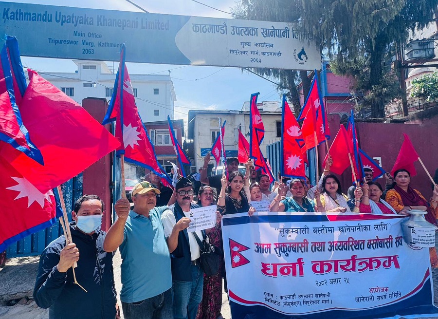 आम जनता पार्टी (आजपा) निकटको आम सुकुम्वासी तथा अव्यवस्थित बसोबास संघले खानेपानीको माग काठमाडौँ उपत्यका खानेपानी लिमिटेड (केयूकेएल) को कार्यालय घेराउ गर्दै धर्ना दिएका छन् ।