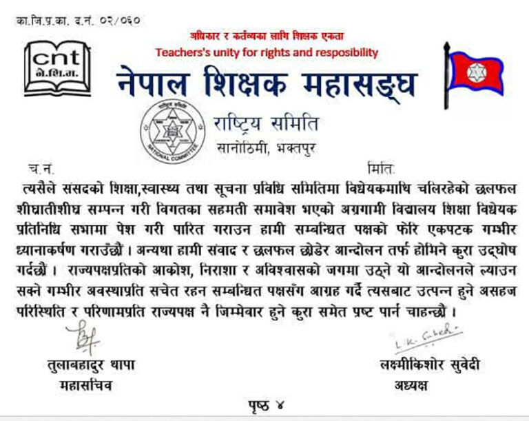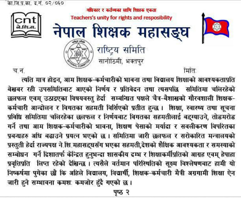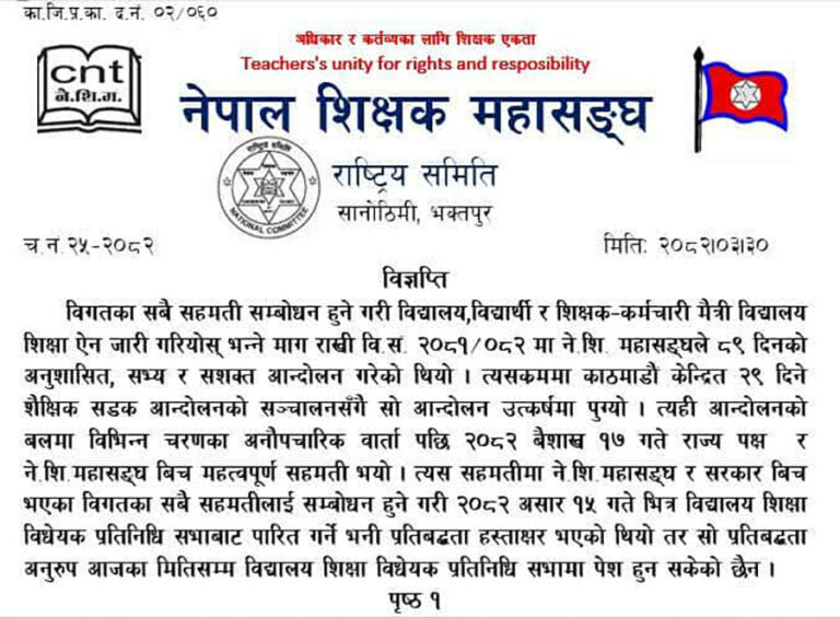 सरकारसँग भएको सहमति अनुसार विद्यालय शिक्षा ऐन जारी नभएपछि शिक्षक महासंघले पुनः आन्दोलनको चेतावनी दिएको छ। महासंघले विगतका सहमति समावेश गरी शिक्षा विधेयक छिटो संसदमा पेस गरी पारित गर्न माग गरेको छ।