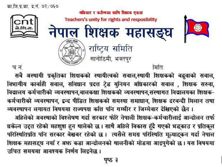 महासंघले अस्थायी शिक्षकको स्थायीत्व, बढुवा, विभागीय कारबाही, ट्रेड युनियन अधिकार, शिक्षक सरुवा, कर्मचारी व्यवस्थापन लगायतका विषयमा सरकार गम्भीर नभएको बताएको छ। महासंघले यसबाट उत्पन्न हुने समस्या र परिणामका लागि राज्यपक्ष जिम्मेवार हुने स्पष्ट पारेको छ।