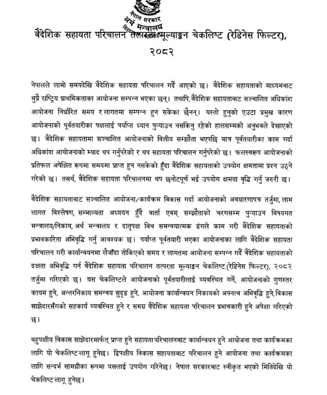 सरकारले अबदेखि पर्याप्त पूर्वतयारीबिना कुनै पनि आयोजना वा कार्यक्रमका लागि वैदेशिक सहायता लिने नीति अख्तियार गर्दै नयाँ प्रणाली लागू गरेको छ । आर्थिक कार्यक्षमता कमजोर देखिनु, कार्यसम्पादन ढिलो हुनु र अपेक्षित परिणाम नआउनुजस्ता समस्या दोहोरिएपछि अर्थ मन्त्रालयले ‘वैदेशिक सहायता तत्परता मूल्याङ्न चेकलिस्ट (रेडिनेस फिल्टर), २०८२’ कार्यान्वयनमा ल्याएको हो ।