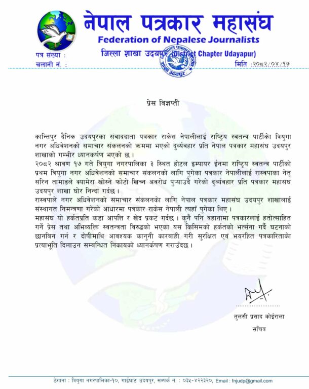 कार्यक्रममा समाचार संकलनकालागि पत्रसहित निम्ता गरेर राष्ट्रिय स्वतन्त्र पाटीकी एक नेतृले सो पाटीको त्रियुगा नगर प्रथम अधिवेसनको समाचार संकलन गर्न गएका पत्रकार राकेश नेपाली उपर दुव्र्यवहार गरेकी छन् ।