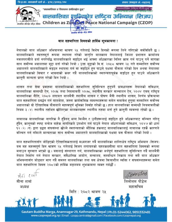 बालबालिका शान्तिक्षेत्र राष्ट्रिय अभियान (सिजप) लगायतका संस्थाहरूले यस ऐतिहासिक दिनलाई बाल सहभागिता दिवसका रूपमा मनाउने परम्परा स्थापित गरेका छन्। सिजपका महासचिव तिलोत्तम पौडेलले बालमैत्री नेपाल निर्माण गर्न, अर्थपूर्ण सहभागिता सुनिश्चित गर्न र यस दिवसलाई संस्थागत बनाउन नेपाल सरकार, संवैधानिक निकाय, मन्त्रालय तथा सबै सरोकारवालालाई जोडदार माग गरेका छन्। साथै, २०८२ सालको बाल सहभागिता दिवसको अवसरमा समस्त बालबालिका तथा यस क्षेत्रमा सक्रिय व्यक्ति र संस्थालाई शुभकामना व्यक्त गरिएको छ।