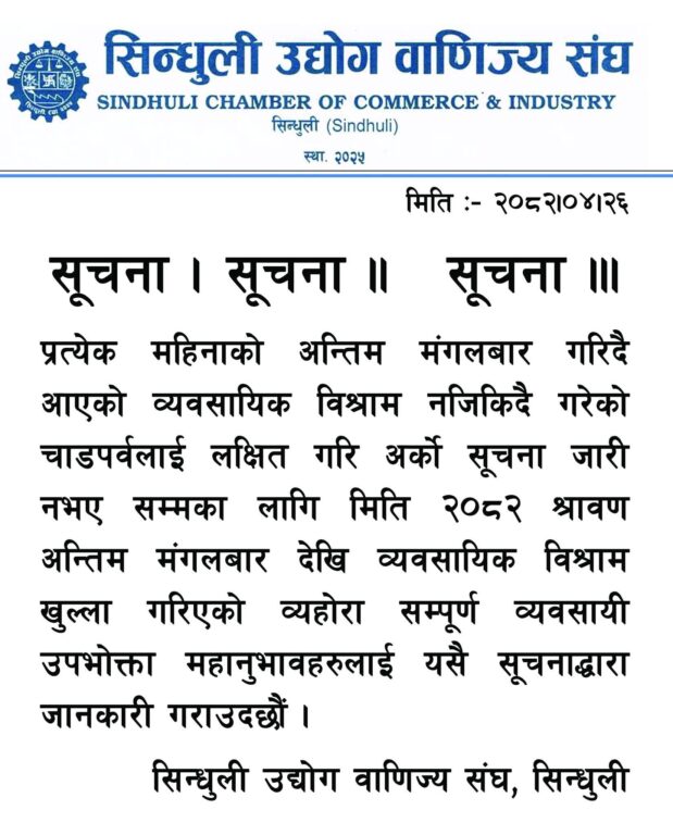 सिन्धुली उद्योग वाणिज्य संघले सूचना जारी गर्दै अबदेखि प्रत्येक महिनाको अन्तिम मंगलबारमा हुने व्यवसायिक विश्राम खुला गरिएको जानकारी दिएको छ।