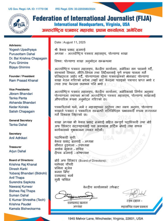 विश्वभर छरिएर रहेका पत्रकारहरुलाई एकीकृत गर्ने उद्देश्यका साथ,आम सञ्चारकर्मीहरूको हक र हितका लागि सङ्गठित रुपमा आवाज उठाउँदै आएको अन्तर्राष्ट्रिय पत्रकार महासंघ पोल्यान्डको अध्यक्षमा संगम दैनिकका प्रधान सम्पादक केशवप्रसाद बजगाईं निर्विरोध निर्वाचित भएका छन्।