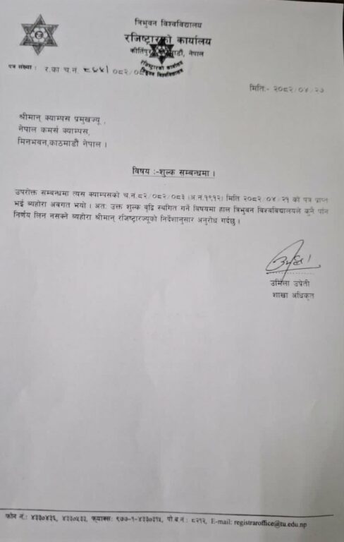 त्रिभुवन विश्वविद्यालयले नेपाल कमर्स क्याम्पस, मिनभवनको शुल्क वृद्धि रोक्ने कुनै निर्णय नभएको स्पष्ट पारेको छ।