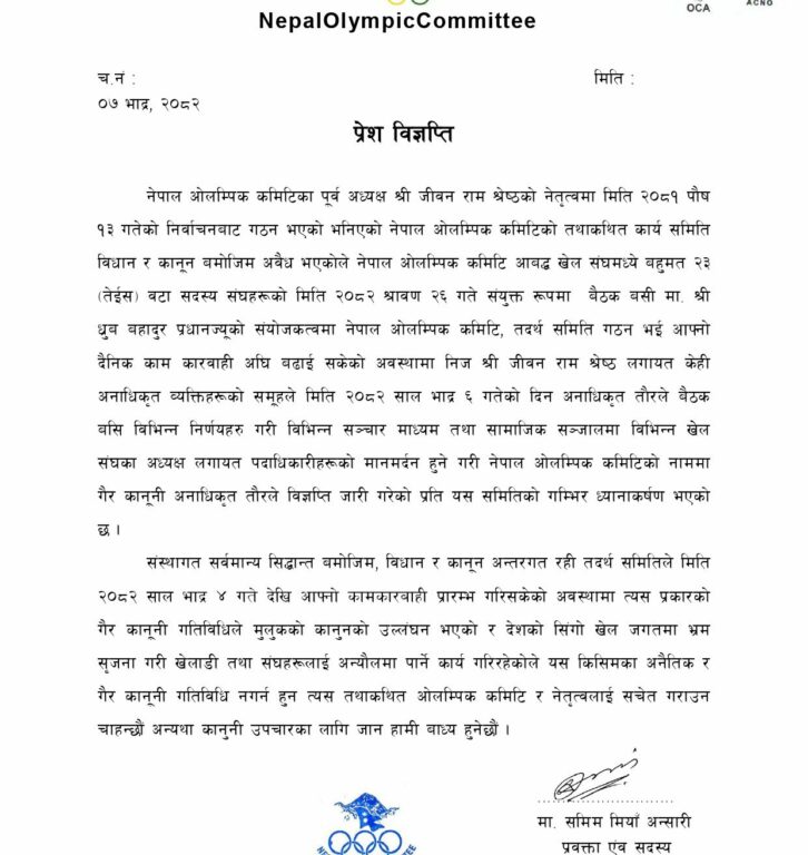 नेपाल ओलम्पिक समितिले पूर्व अध्यक्ष जीवनराम श्रेष्ठको नेतृत्वमा गठन गरिएको तदर्थ कार्य समितिलाई गैरकानुनी र विधानविपरीत भन्दै आपत्ति जनाएको छ। समितिले विज्ञप्ति जारी गर्दै २०८२ साउन २६ गते गरिएको तदर्थ समिति गठनलाई अस्वीकार गर्दै, उक्त निर्णय नेपाल ओलम्पिक समिति, त्यसको विधान तथा प्रचलित कानूनअनुसार अमान्य रहेको स्पष्ट पारेको छ।