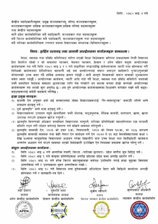 शिक्षा, स्वास्थ्य तथा प्रविधि समितिबाट पारित भएको शिक्षा विधेयकमा कतिपय प्रावधानहरू निजी विद्यालय हित विपरित रहेको उल्लेख गर्दै ५ र ६ गते माइतीघर मण्डलादेखि बानेश्वरसम्म ज्यानी तथा कोणसभा गरी विरोधको कार्यक्रममा मा सहभागि सबैलाइई धन्यबाद दिएको छ ।