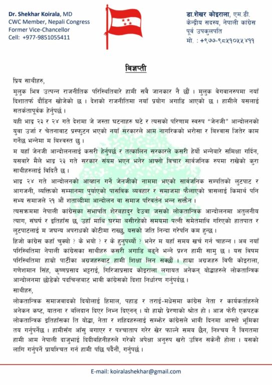नेपालको राजनीतिमा उत्पन्न नयाँ परिस्थिती र जेनजी आन्दोलनका प्रभावबारे नेपाली कांग्रेसका नेता डा.शेखर कोइरालाले आफूले सार्वजनिक गरेका विचारहरुमा गम्भीर समिक्षा गरेका छन्। उनले भाद्र २३ र २४ गते भएका घटनाहरुलाई ध्यानमा राख्दै नेपाली कांग्रेसको भविष्यको दिशा तय गर्नुपर्ने महत्वपूर्ण समय आएको बताएका छन्।