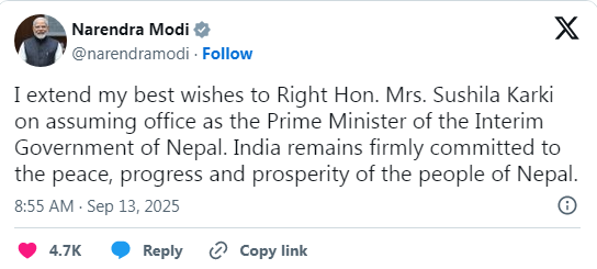 मोदीले सामाजिक सञ्जाल मार्फत एक सन्देश पोस्ट गर्दै, नेपालको अन्तरिम सरकारको प्रधानमन्त्रीको पदभार ग्रहण गर्नुभएकोमा सम्माननीय श्रीमती सुशीला कार्कीलाई मेरो हार्दिक बधाई तथा शुभकामना। भारत नेपालका जनताको शान्ति, प्रगति र समृद्धिको लागि सदैव प्रतिबद्ध छ, भनेका छन्।