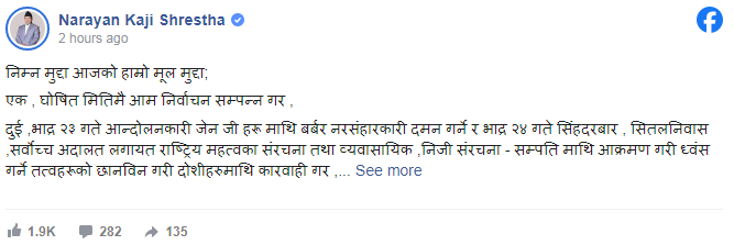 नेकपा माओवादी केन्द्रका वरिष्ठ उपाध्यक्ष नारायणकाजी श्रेष्ठले आम निर्वाचन घोषित मितिमै सम्पन्न गर्नुपर्नेमा जोड दिएका छन् ।