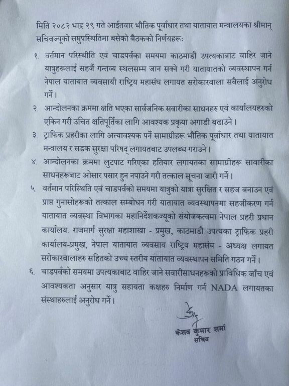 त्यस्तै, आन्दोलनका क्रममा क्षति पुगेका सार्वजनिक सवारीसाधनको क्षतिपूर्ति प्रक्रिया अघि बढाउने, ट्राफिक प्रहरीलाई आवश्यक सामग्री उपलब्ध गराउने र हतियार वा संवेदनशील सामान सवारीसाधनमा ओसारपसार रोक्न तत्काल सूचना जारी गर्ने निर्णय पनि बैठकले गरेको छ।