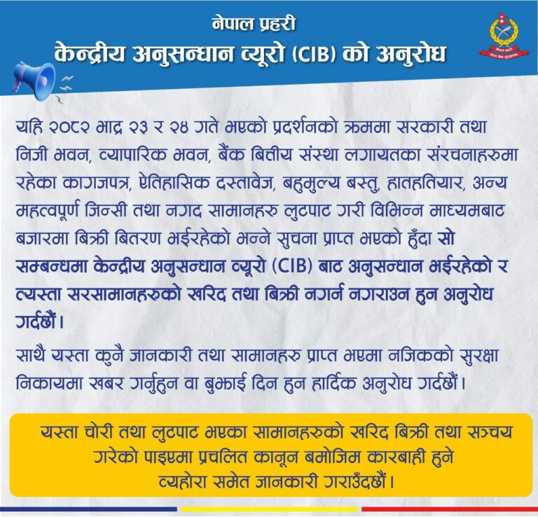 CIB ले लुटिएका सामान विभिन्न माध्यममार्फत बजारमा बिक्री भइरहेको सूचना पाएपछि सर्वसाधारणलाई यस्ता सामान खरिद–बिक्री नगर्न वा नगराउन आग्रह गरेको छ। साथै यस्ता सामान वा जानकारी प्राप्त भएमा नजिकको सुरक्षा निकायलाई खबर गर्न पनि अनुरोध गरिएको छ।