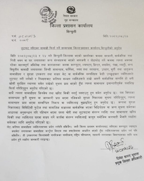 सिन्धुली जिल्लामा भदौ २३ र २४ गते भएको प्रदर्शनका क्रममा तोडफोड र आगजनी हुँदै सरकारी, सार्वजनिक तथा निजी सम्पत्तिहरु लुटपाट भएकोप्रति जिल्ला प्रशासन कार्यालय, सिन्धुलीले ध्यानाकर्षण गराएको छ।