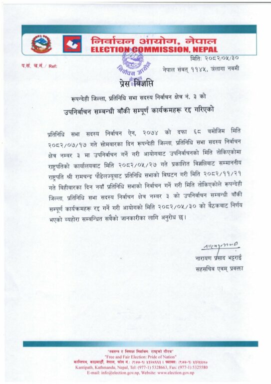 आगामी कात्तिक १७ गते तोकिएको रुपन्देही–३ को प्रतिनिधिसभा उपनिर्वाचन निर्वाचन आयोगले रद्द गरेको छ ।
