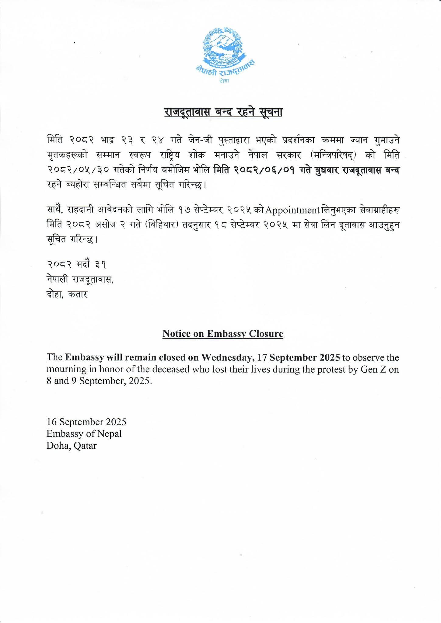 नेपाली राजदूतावास, दोहाले एक सूचना जारी गर्दै २०८२ भदौ २३ र २४ गतेको प्रदर्शनमा ज्यान गुमाएका मृतकहरूको सम्मानस्वरूप नेपाल सरकारले घोषणा गरेको राष्ट्रिय शोकको अवसरमा आगामी २०८२ असोज १ गते (सेप्टेम्बर १७, २०२५) राजदूतावास बन्द रहने जनाएको छ।