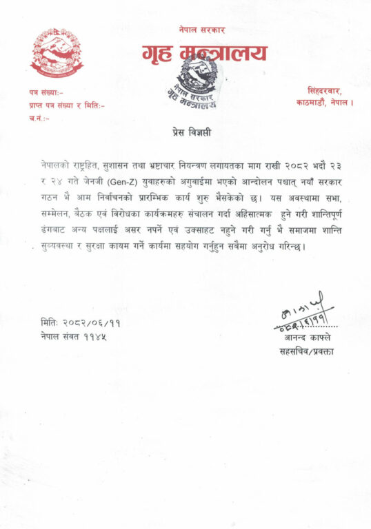 गृह मन्त्रालयले हालैको जेनजी आन्दोलनमा देखिएको घुसपैठलाई ध्यानमा राख्दै आगामी विरोध कार्यक्रमहरू शान्तिपूर्ण र अहिंसात्मक ढङ्गबाट गर्न आग्रह गरेको छ।