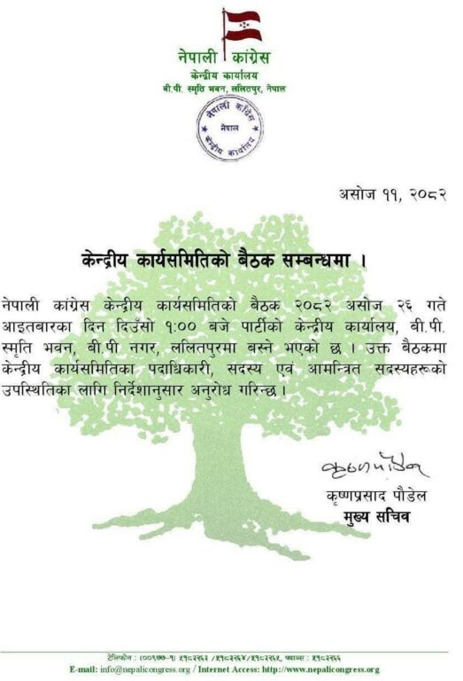 नेपाली कांग्रेसले असोज २६ गते सानेपास्थित पार्टी केन्द्रीय कार्यालयमा केन्द्रीय कार्यसमिति बैठक बोलाएको छ। पार्टीका मुख्यसचिव कृष्णप्रसाद पौडेलद्वारा जारी सूचनामा पदाधिकारी, सदस्य तथा आमन्त्रित सदस्यहरूलाई उपस्थित हुन अनुरोध गरिएको छ।