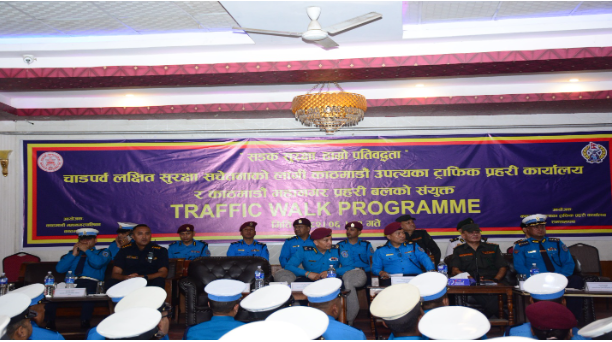 काठमाडौँ उपत्यका ट्राफिक प्रहरी कार्यालय र काठमाडौँ महानगर प्रहरी बलको संयुक्त आयोजनामा चाडपर्व लक्षित ‘ट्राफिक वाक’ कार्यक्रम आज सम्पन्न भएको छ। ‘सडक सुरक्षा हाम्रो प्रतिबद्धता’ नारासहित रानीपोखरीदेखि रामशाहपथसम्म जनचेतनामूलक र्याली निकालिएको थियो।