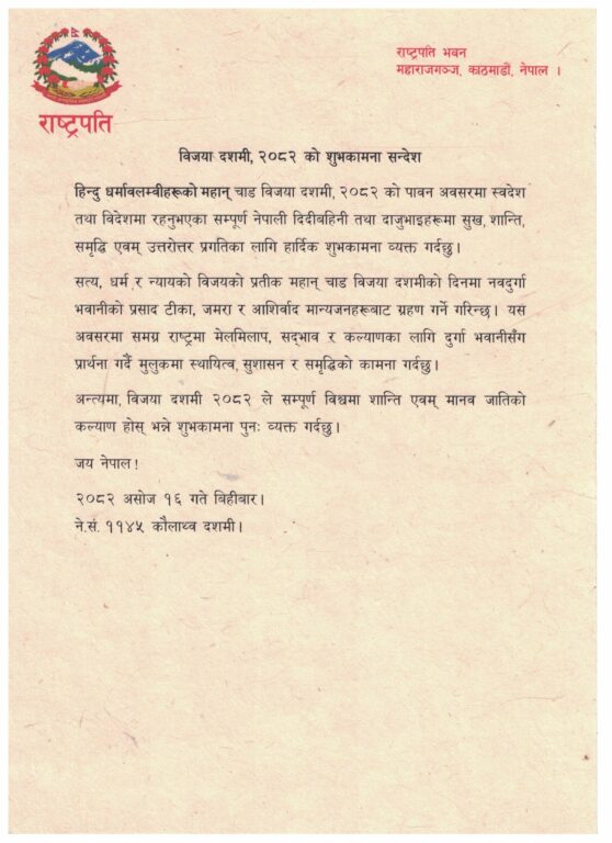 राष्ट्रपति रामचन्द्र पौडेलले विजयादशमी २०८२ को अवसरमा सम्पूर्ण नेपालीहरूमा सुख, शान्ति, समृद्धि र प्रगतिका लागि शुभकामना व्यक्त गरेका छन्।