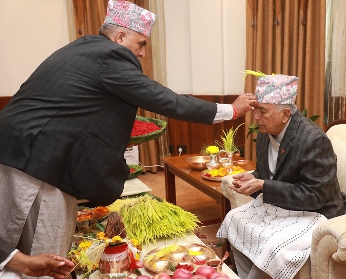 शीतल निवासमा सम्पन्न कार्यक्रममा राष्ट्रपति पौडेलले टीका लगाएपछि प्रथम महिला र परिवारका सदस्यलाई पनि टीका लगाइदिएका थिए।