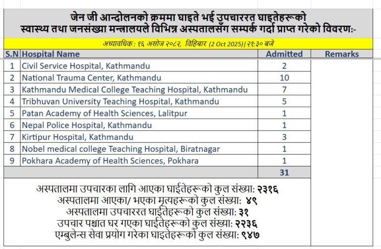 हालसम्म आन्दोलनका क्रममा अस्पतालमा आएका घाइतेहरूको कुल संख्या २,३१६ पुगेको छ। तीमध्ये २,२३६ जना उपचारपछि घर फर्किएका छन् भने ४९ जनाको मृत्यु भएको छ। एम्बुलेन्स सेवा प्रयोग गरेका घाइतेहरूको संख्या ९४७ रहेको मन्त्रालयले जनाएको छ।