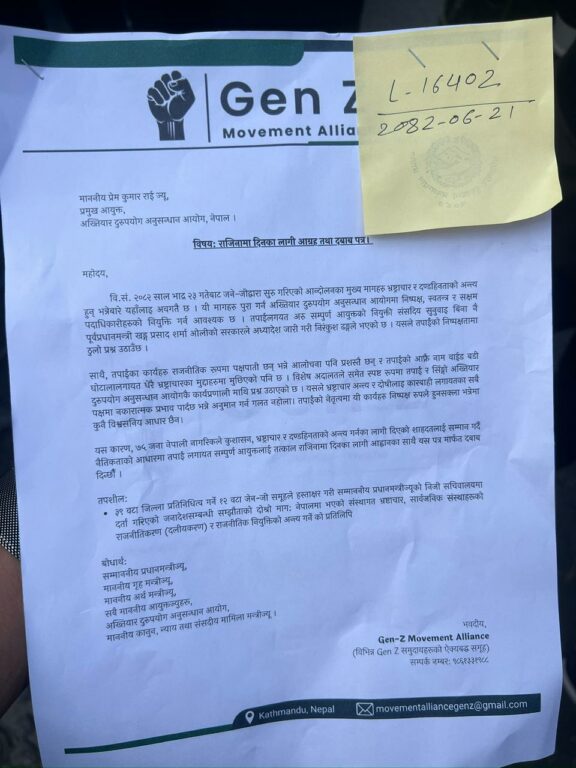 जेनजी मुभमेन्ट अलायन्सले अख्तियार दुरुपयोग अनुसन्धान आयोगका प्रमुख आयुक्त प्रेमकुमार राईसहित सम्पूर्ण आयुक्तहरूको राजीनामा माग गर्दै आयोगमा दबाब पत्र बुझाएको छ।