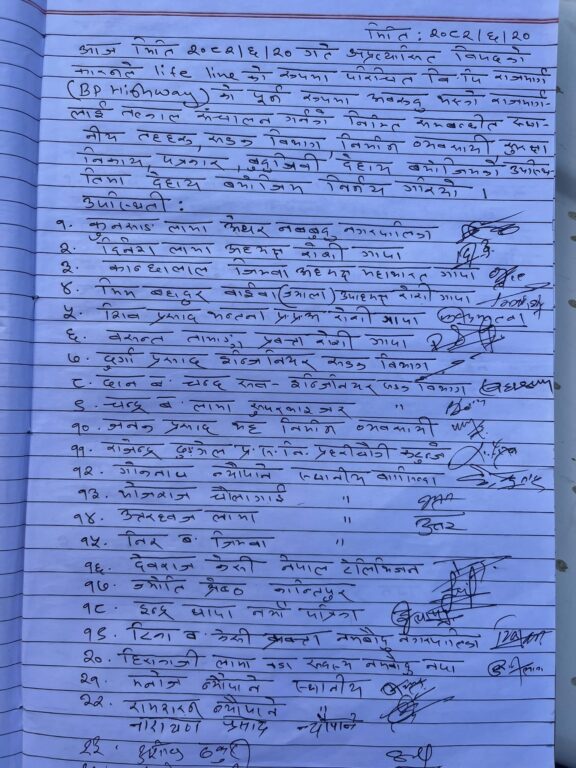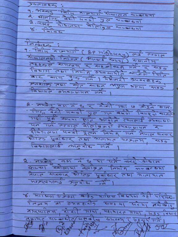 ‘अवरुद्ध विपि राजमार्ग संचालन गर्ने, थानसिङ्ग बेशीमा पक्कि पुल निर्माण र चरङ्गे फेदीको दोभानमा बेलिव्रिज निर्माण गर्ने सम्वन्धमा आवश्यक निर्णय भएको छ’– महाभारत गाउँपालिका अध्यक्ष कान्छालाल जिम्बाले भने–‘नमोबुद्ध ६ मा पर्ने चरङ्गे दोभान दाप्चा खोलामा बेलिव्रिज निर्माढा गर्न नेपाल सरकार भौतिक पूर्वाधार तथा यातायात मन्त्रालयलाई अनुरोध गर्ने निर्णय भएको छ ।