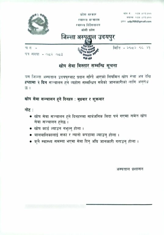 जिल्ला अस्पताल उदयपुरले नियमित खोप सेवा विस्तार गरेको छ । सेवाग्राहीको सुविधालाई ध्यानमा राख्दै अस्पतालले अब हप्तामा दुई दिन बुधबार र शुक्रबार खोप सेवा सञ्चालन गर्ने भएको छ ।