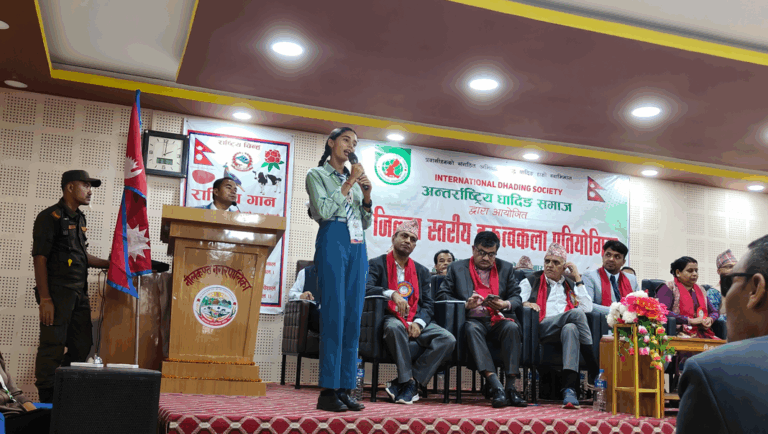 अन्तर्राष्ट्रिय धादिङ समाजले आयोजना गरेको जिल्ला स्तरीय ूयुवा पुस्ताको चाहना स् असल नेतृत्व र इमान्दार राजनितिू शिर्षक जिल्ला स्तरीय वक्तृत्वकला प्रतियोगिताका शुक्रबार धादिङबेसीमा सम्पन्न भएको छ ।