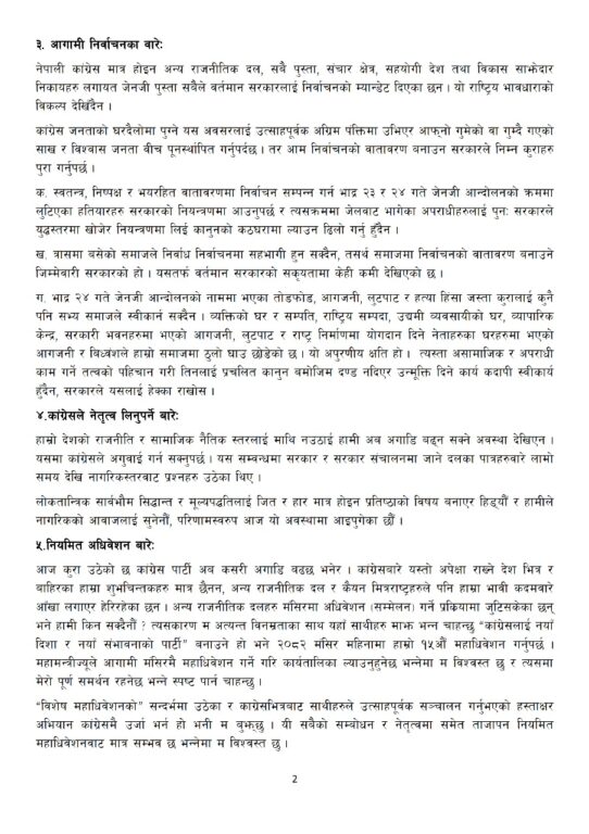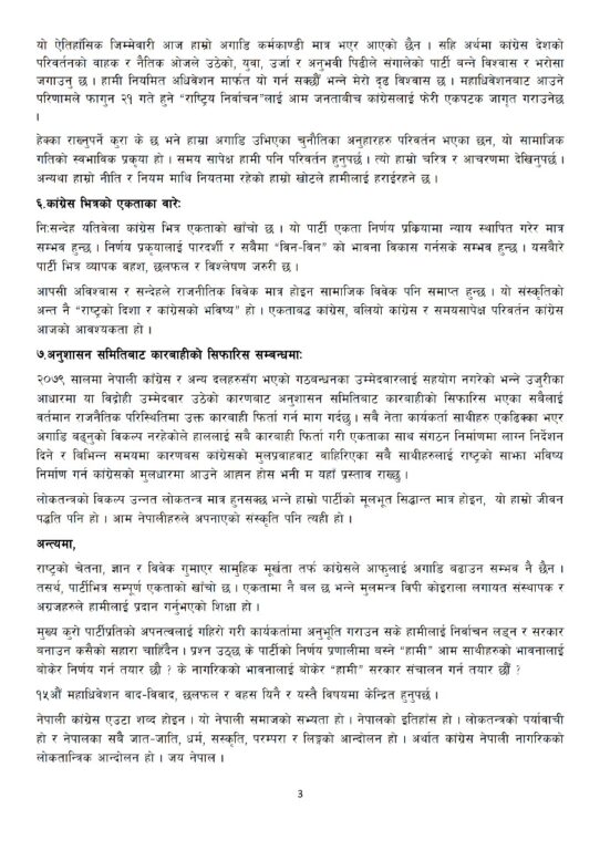 उनले कांग्रेसभित्रको एकताको खाँचो औंल्याउँदै अनुशासन समितिबाट सिफारिस भएका कारबाहीहरू फिर्ता गरी सबै कार्यकर्तालाई मूलधारमा ल्याउनुपर्ने धारणा व्यक्त गरे। साथै, कांग्रेसले सामाजिक र नैतिक नेतृत्व लिनुपर्नेमा जोड दिंदै १५औं महाधिवेशनले पार्टीलाई पुनः जागृत गर्ने विश्वास व्यक्त गरे।