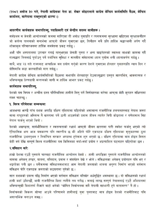 कोइरालाले जेनजी आन्दोलनका क्रममा मारिएका युवा तथा सुरक्षाकर्मीप्रति श्रद्धाञ्जली अर्पण गर्दै दोषीमाथि कडा कारबाही र घाइतेको उचित उपचारको माग पनि गरे। उनले सरकारलाई त्रासमुक्त वातावरणमा स्वतन्त्र निर्वाचन सम्पन्न गर्न आवश्यक पूर्वाधार तयार गर्न आग्रह गरे।