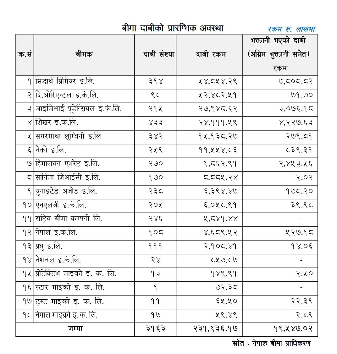 बीमा प्राधिकरणका अनुसार यो प्रारम्भिक विवरण हो र दाबीको सत्यता तथा मूल्यांकन प्रक्रिया जारी छ । अधिकांश दाबीहरू अग्रिम भुक्तानीसहितको अवस्थामा छन् र क्षतिको पूर्ण मूल्यांकनपछि अन्तिम भुक्तानी चरणबद्ध रूपमा हुने प्राधिकरणले जनाएको छ