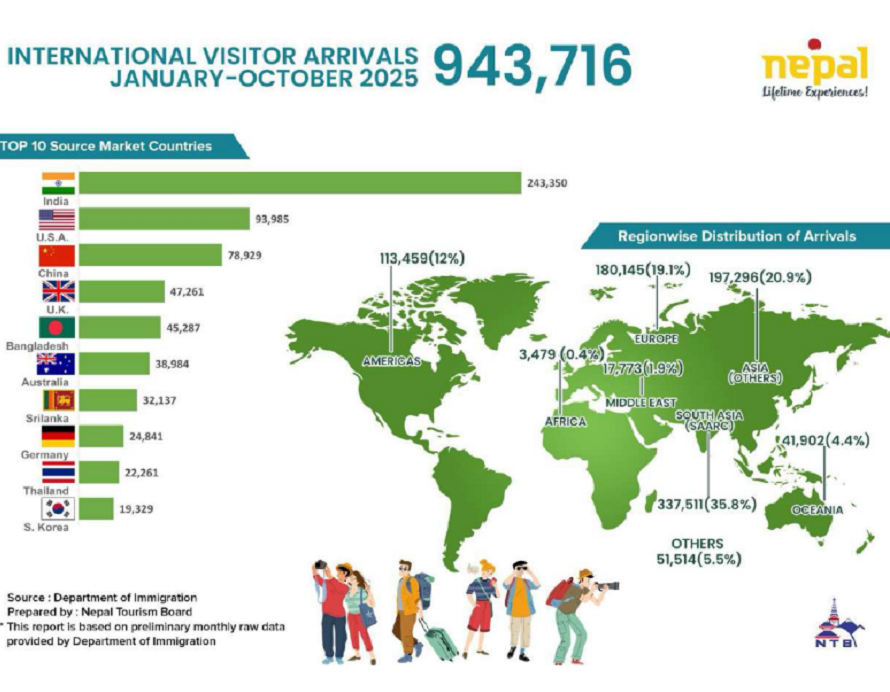 त्यस्तै, अमेरिकी मुलुकबाट १६ हजार ४०७, ओसियाना क्षेत्रबाट ६ हजार ८१४, मध्यपूर्वबाट ३ हजार ५४८, अफ्रिकाबाट ४४३ र अन्य क्षेत्रबाट ८ हजार ४४४ पर्यटक नेपाल आएका छन् । सन् २०२५ को जनवरीदेखि अक्टोबरसम्मका १० महिनामा नेपालमा सबैभन्दा धेरै पर्यटक भारतबाट आएका छन् (२ लाख ४३ हजार ३५० जना। त्यसपछि अमेरिका (९३ हजार ९८५) र चीन (७८ हजार ९२९) क्रमशः दोस्रो र तेस्रो स्थानमा छन् । बेलायतबाट ४७ हजार २६१, बंगलादेशबाट ४५ हजार २८७, अस्ट्रेलियाबाट ३८ हजार ९८४, श्रीलंकाबाट ३२ हजार १३७, जर्मनीबाट २४ हजार ८४१, थाइल्यान्डबाट २२ हजार २६१ र दक्षिण कोरियाबाट १९ हजार ३२९ जना पर्यटक नेपाल आएका छन् ।