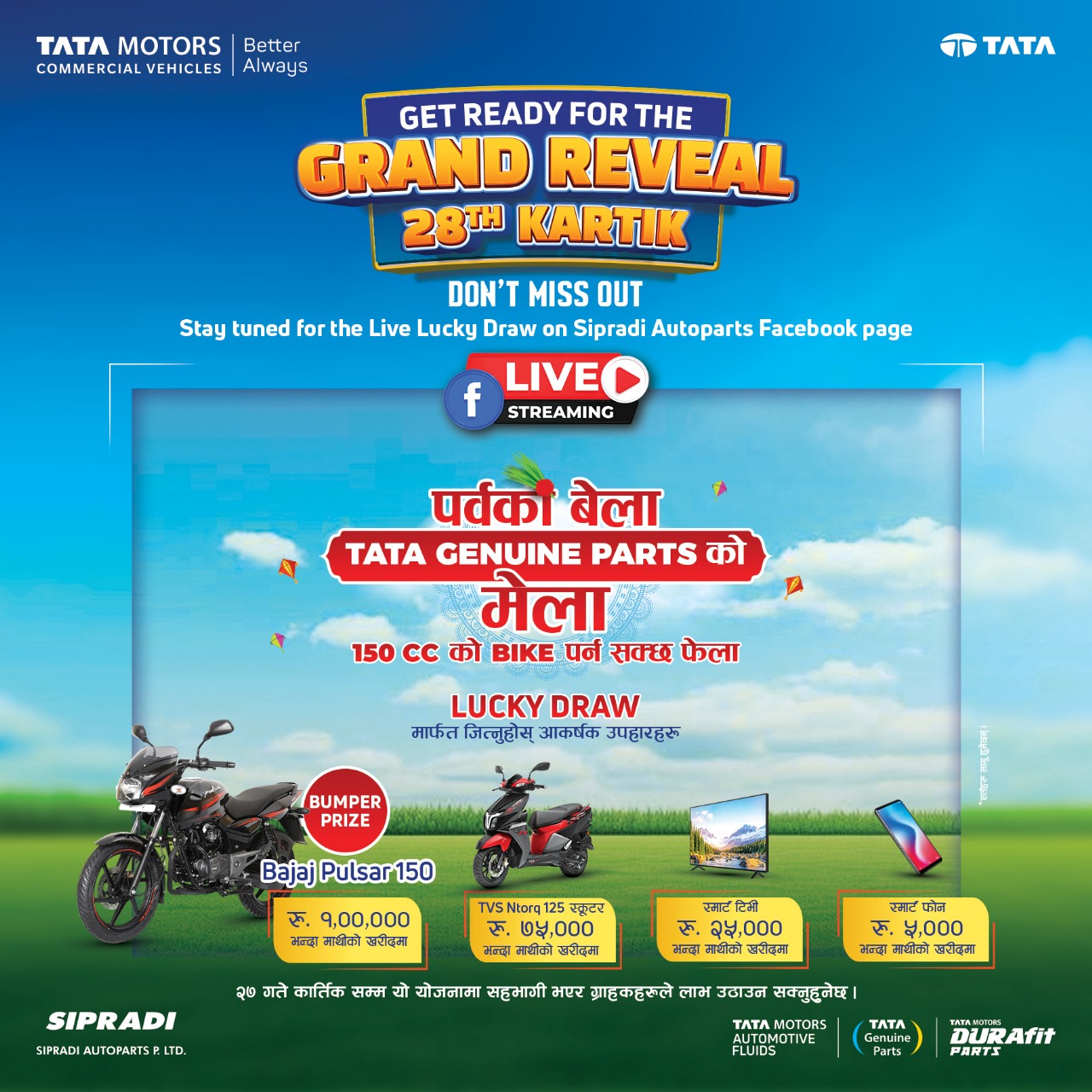 सिप्रदी अटोपाट्र्स प्रा.लि. द्वारा सञ्चालित “पर्वको बेला टाटा जेन्युइन पाट्र्सको मेला” अन्तर्गत ग्राहकले अब कार्तिक २७ गतेसम्म सहभागी हुन सक्ने भएका छन् ।