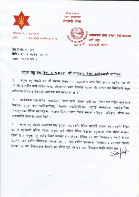 संयुक्त राष्ट्र संघको ८०औं स्थापना दिवस (UN Day–2025) को अवसरमा नेपाली सेनाले आज मिति २०८२ कार्तिक २० गते पाँचखालस्थित श्री वीरेन्द्र शान्ति कार्य तालिम केन्द्रमा विशेष कार्यक्रमको आयोजना गरी मनाएको छ। कार्यक्रमका प्रमुख आतिथ्य प्रधान सेनापति महारथी श्री अशोक राज सिग्देल रहनुभएको थियो।