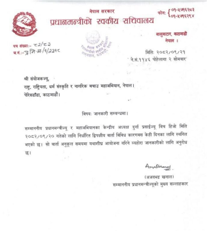 सम्माननीय प्रधानमन्त्री र राष्ट्र, राष्ट्रियता, धर्म संस्कृति र नागरिक बचाउ महाअभियानका केन्द्रीय अध्यक्ष दुर्गा प्रसाईंबीच २०८२ साल पुस २० गतेका लागि तय गरिएको द्विपक्षीय वार्ता विविध कारणले केही दिनका लागि स्थगित गरिएको छ।