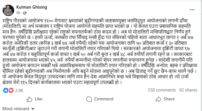 १२०० मेगावाट क्षमताको बूढीगण्डकी जलाशययुक्त जलविद्युत आयोजनाको लगानी ढाँचामा सहमति भएपछि पूर्व ऊर्जामन्त्री कुलमान घिसिङले यसलाई आफ्नो कार्यकालको महत्वपूर्ण उपलब्धि भनेका छन्।