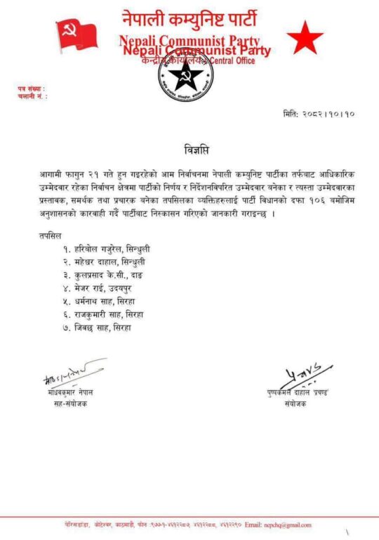 पार्टीको निर्णयविपरीत उम्मेदवारी दिएको आरोपमा नेपाली कम्युनिस्ट पार्टी (नेकपा)ले हरिबोल गजुरेल र महेश्वर दाहाललाई पार्टीबाट निष्कासन गरेको छ ।